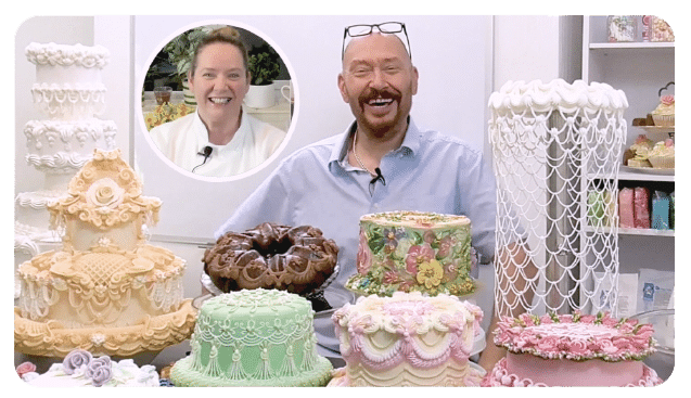 Join David and Hayley, assisted by Ed and take a online ‘front row seat’ to watch and learn creative free-hand cake decorating, while watching the unscripted live production process. Enjoiy an exciting blend of cake decorating chat, latest news and answering cake decorating questions with visual cake decorating tips and in-depth technical advice.
